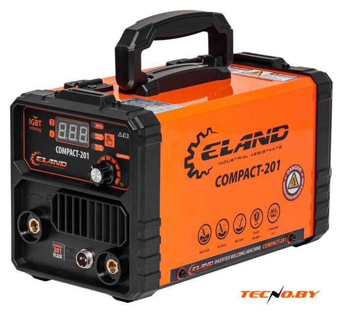 ELAND COMPACT-201 способен работать в сетях с пониженным напряжением от 160 до 220 В, что делает его особенно полезным при нестабильных условиях питания. Благодаря этой функции, аппарат сохраняет свою производительность даже в удаленных местах или на стройплощадках с нестабильным напряжением. 🔋