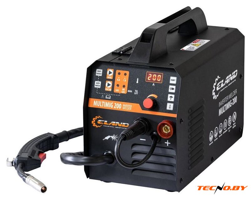 Приобретается ELAND MULTIMIG-200 в комплекте с всем необходимым для начала работы: сварочный щиток, молоток-щетка, горелка АК15 с промрукавом 2 м, кабель с держателем электрода 1.9 м, кабель заземления 1.6 м, сетевой кабель без вилки 2 м. Габариты устройства – 370x185x290 мм, а вес всего 10 кг делают его компактным и мобильным, что особенно удобно при необходимости частой транспортировки.