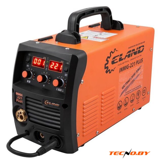 При сравнительно небольших размерах (440 мм x 210 мм x 290 мм) и весе 11.9 кг, ELAND INMIG-221 PLUS остается очень мобильным и удобным в транспортировке. В комплекте поставки вы найдете все необходимое для начала работы: сварочный щиток, молоток-щетка, горелка АК15 с евроразъемом длиной 3 м, кабель с держателем электрода 1,8 м, кабель заземления 1,2 м, сетевой кабель 2 м и два наконечника для сопла горелки (0,6 и 0,8 мм).