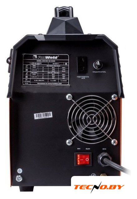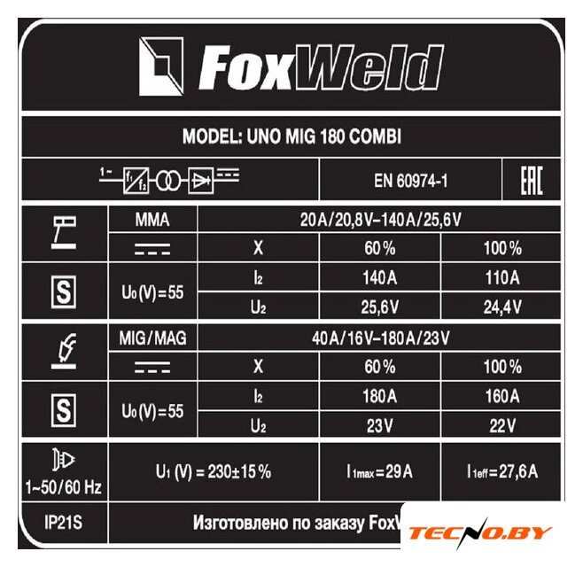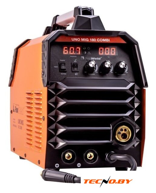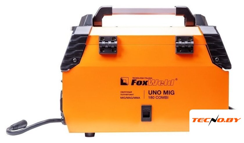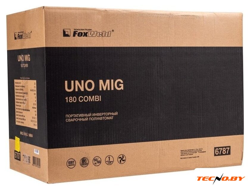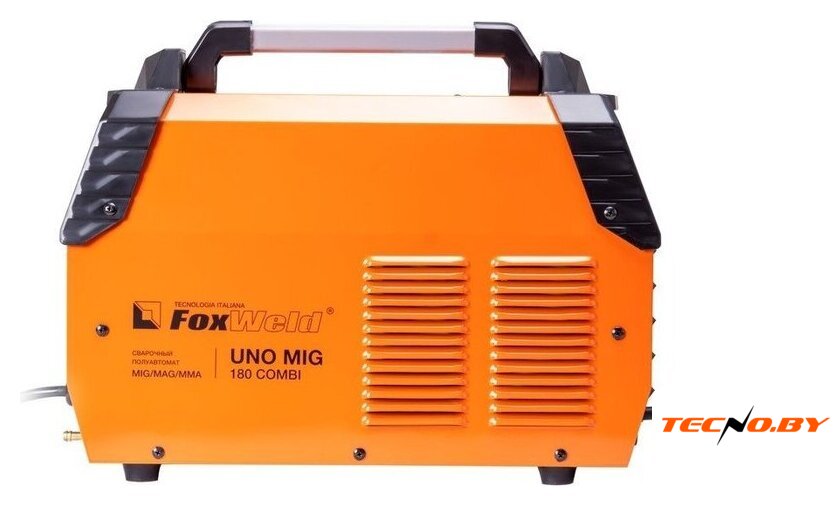 | Комплект поставки | • Сварочный полуавтомат FOXWELD UNO MIG 180 COMBI – 1 шт.;• Горелка MIG-15AK 3 м – 1 шт.;• Зажим для заземления 200 А с кабелем 2 м – 1 компл.;• Электрододержатель с кабелем 200 А 2 м – 1 шт.;• Газовый шланг – 1 шт.;• Комплект ЗИП (сопло, 2 наконечника, 2 хомута) – 1 компл.;• Инструкция – 1 шт.;• Гарантийный талон – 1 шт. |