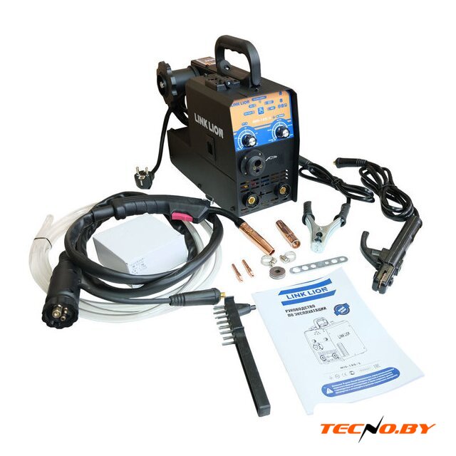 Link Lion MIG-180/5 поставляется с полным набором для выполнения различных задач: встроенная горелка длиной 2 м, комплект ЗИП для полуавтоматической горелки, электродный держатель с кабелем 1.8 м, и кабель-масса с зажимом длиной 1.2 м. В комплект также входит катушка с самозащитной проволокой диаметром 1 мм и весом 0.25 кг, щетка по металлу, газовый шланг и инструкция-паспорт с перечнем гарантийных мастерских.