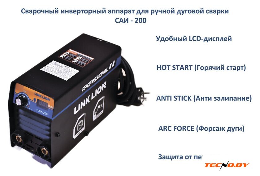 Link Lion САИ-200 оснащен полезными дополнительными функциями, которые облегчат процесс сварки. Горячий старт обеспечивает легкий запуск даже в сложных условиях. Форсаж дуги помогает поддерживать стабильность дуги, а система антизалипания электрода предотвратит свертывание и блокировку электрода. Благодаря этим функциям, работа с аппарат становится проще и комфортнее, даже для начинающих сварщиков.