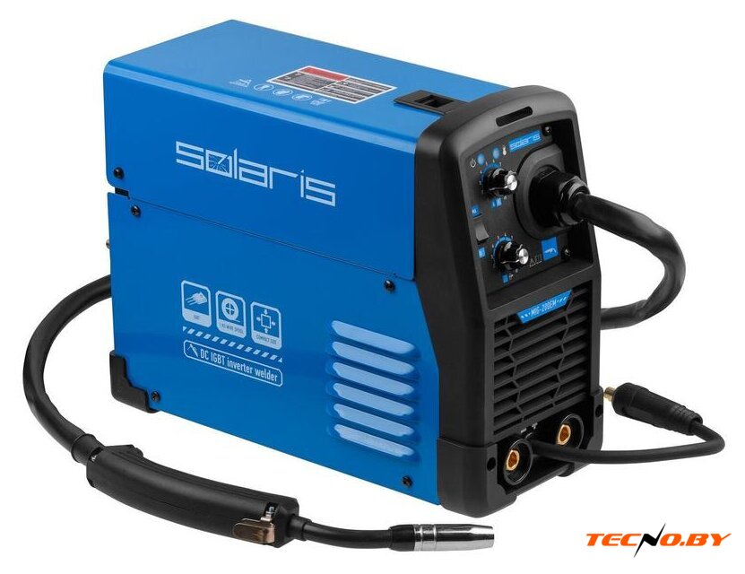 Solaris MIG-200EM поставляется с полной комплектностью, необходимой для начала работы: полуавтомат, сварочная горелка длиной 2 м, а также две клеммы заземления с кабелями длиной 1.6 м и 1.2 м. В комплект также входит руководство по эксплуатации, чтобы вы могли быстро освоить все функции устройства.