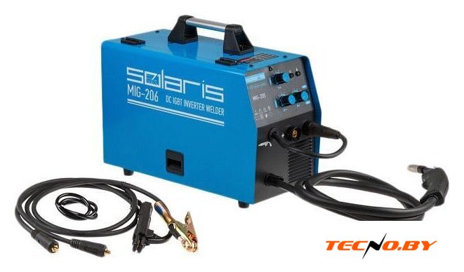 Solaris MIG-206 компактен и удобен в транспортировке благодаря своим размерам (длина: 440 мм, ширина: 197 мм, высота: 340 мм) и весу 14 кг. В комплект поставки входят все необходимые аксессуары: инверторный полуавтомат, сварочная горелка, электрододержатель, заземляющая клемма с кабелем и подающий ролик для проволоки. С ними вы сразу можете приступить к работе, имея все при себе.