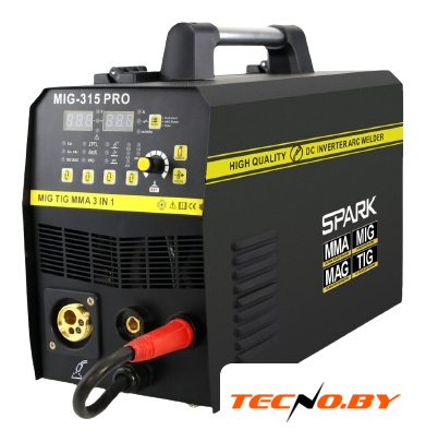 Сварочный инвертор Spark MIG-315Pro представляет собой мощное и надежное устройство, благодаря которому вам под силу выполнение различных сварочных задач. Этот аппарат идеально подходит для ручной дуговой сварки (MMA), полуавтоматической сварки (MIG MAG FCAW) и аргонодуговой сварки (TIG). Работая от обычной сети с напряжением 220 В, он обеспечивает сварочный ток в диапазоне от 10 до 200 А, с мощностью на максимальном токе 7.8 кВт.