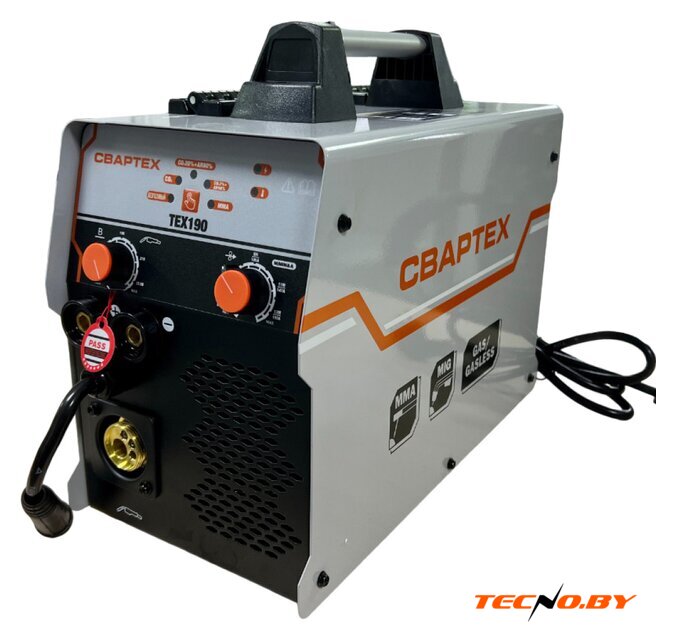 Сварочный инвертор Свартех ТЕХ-190 поставляется в комплекте с необходимыми аксессуарами для немедленного начала работы. В комплекте — сварочная горелка длиной 2,0 м, электродный держатель с силовым кабелем 1,5 м, кабель-масса с зажимом 1,3 м, катушка самозащитной проволоки, а также инструкция-паспорт. Оригинальная упаковка обеспечивает безопасную транспортировку.