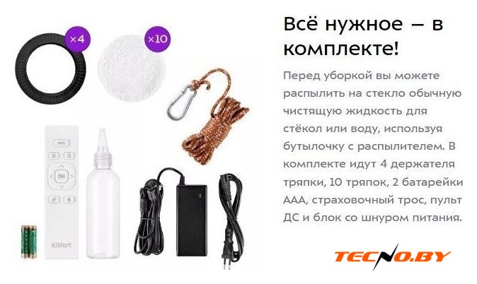 | Комплектация | - пульт ДУ, - документация, - сетевой кабель, - батарейки (2 шт.), - ткань для влажной уборки (10 шт.), - страховочный трос, - кольцо для салфеток (4 шт.), - флакон. |