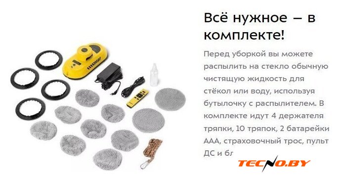 | Комплектация | - пульт ДУ, - документация, - сетевой кабель, - батарейки (2 шт.), - ткань для влажной уборки (10 шт.), - страховочный трос, - кольцо для салфеток (4 шт.), - флакон. |