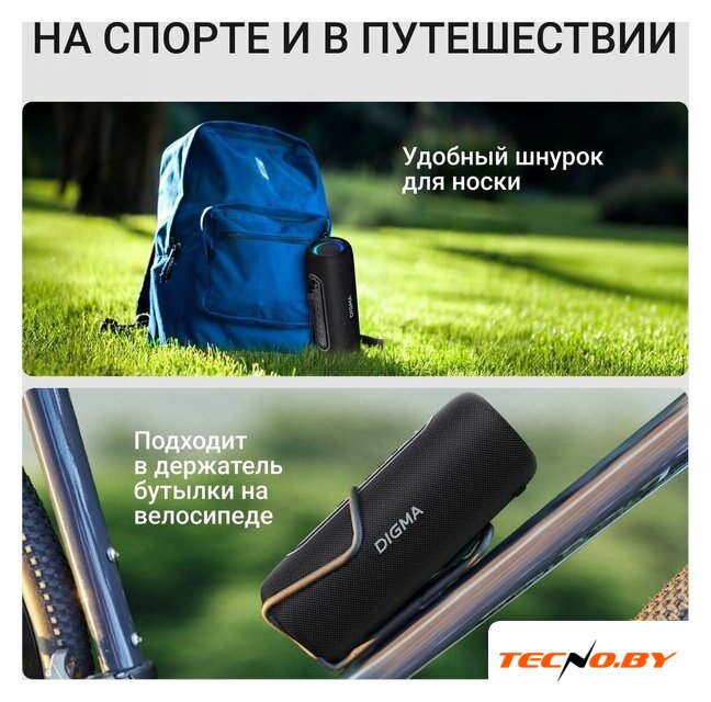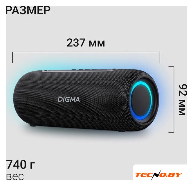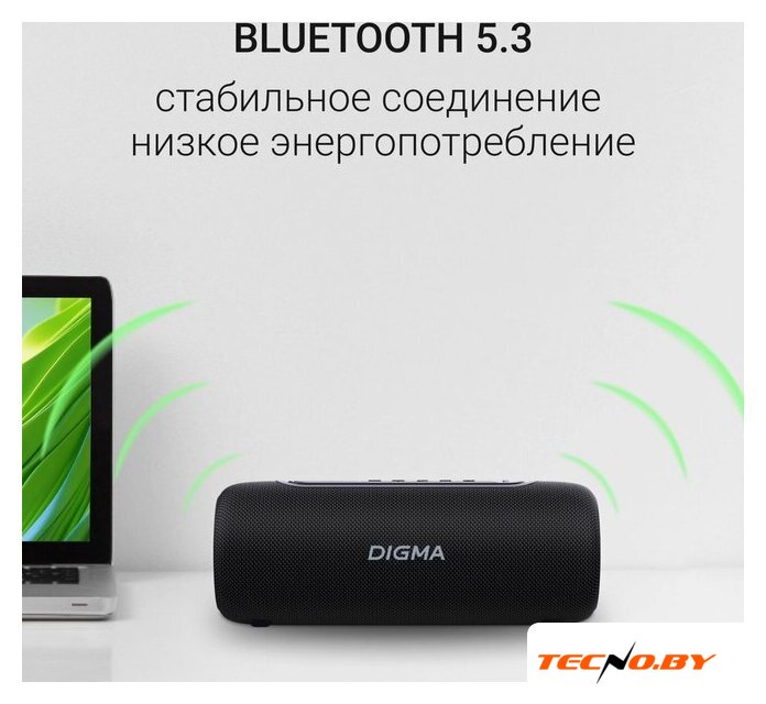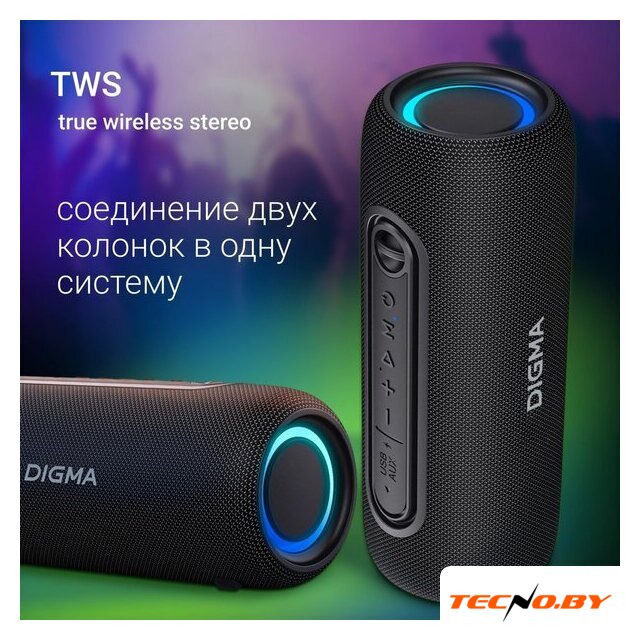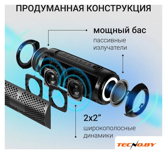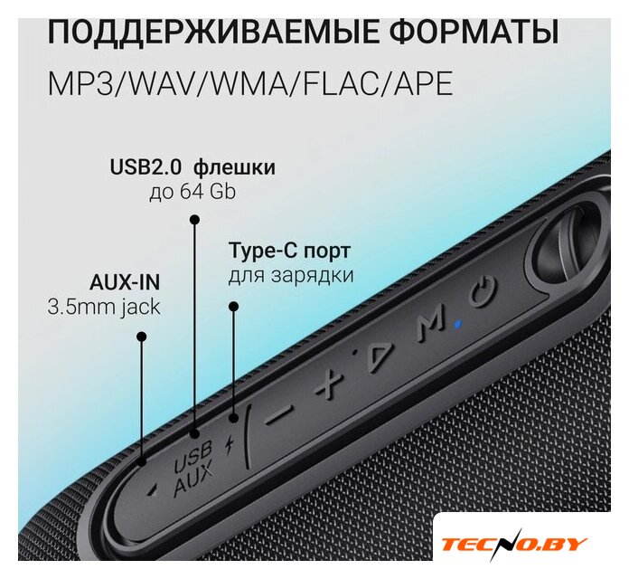 номинальная мощность 20 Вт, воспроизведение с USB/microSD, питание от аккумулятора, BT 5.3, AUX, влагозащита IPX6, время работы: 6 ч.