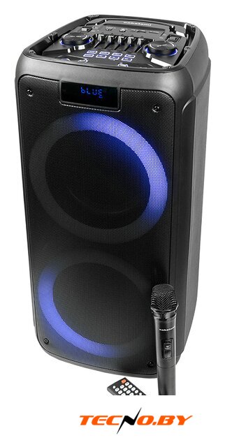 номинальная мощность 100 Вт, воспроизведение с USB/SD, питание от сети и аккумулятора, BT, AUX, время работы: 5 ч.