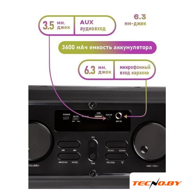 номинальная мощность 20 Вт, воспроизведение с USB, питание от аккумулятора, BT 5.0, AUX, время работы: 5 ч.
