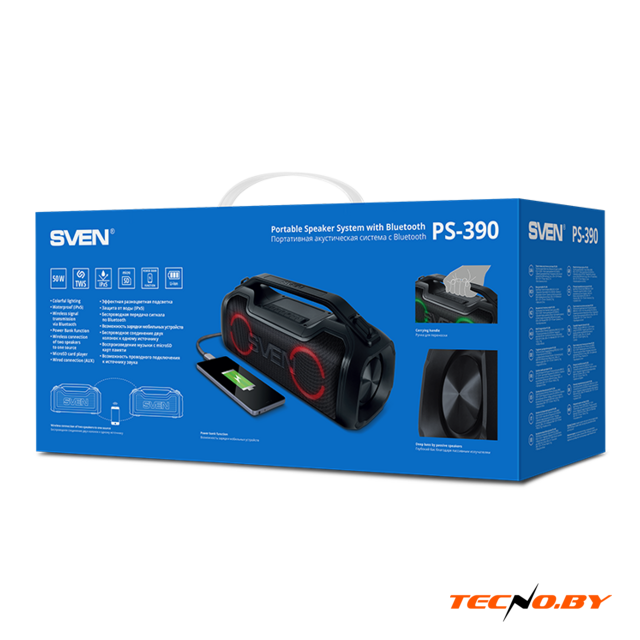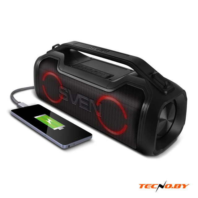 номинальная мощность 25 Вт, воспроизведение с USB, питание от аккумулятора, BT 5.0, AUX, влагозащита IP67, время работы: 5 ч.